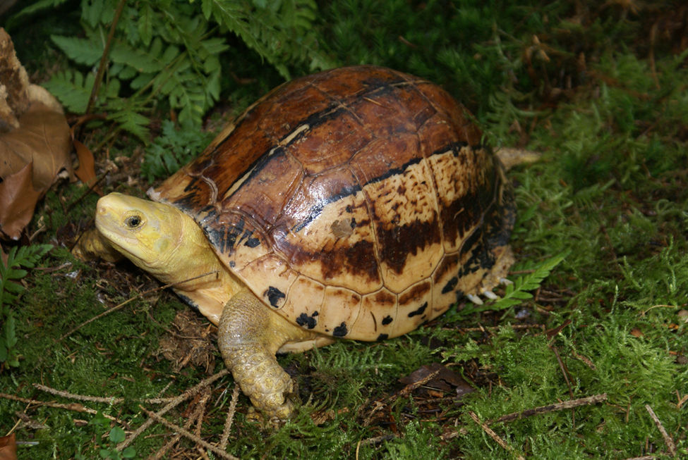 C. picturata is characterized by an orange-brown to dark brown carapace with a cream-colored band extending along the lateral side, through each costal scute. It has a cream/yellow head with fine grayish reticulations, and a cream plastron with a large black spot on each scute. The species reaches 15–19 cm SCL. Males usually have a slightly concave plastron, larger claws and a thicker and longer tail than females. The remaining suitable habitat of this species covers less than 3000 km2, and it is estimated that at most 3,000-10,000 animals survive in the wild (a very optimistic range of values). The species was hunted for local consumption in historic times, but now virtually all specimens found are smuggled to Chinese pet and food markets or sold as medicine, despite CITES Appendix II ranking, which has been in effect since 2000 and subsequently elevated to App I in 2019. Along with high hunting pressure comes habitat destruction from logging and conversion of forest into farmland. This species is rather delicate to keep in captivity and easily stressed. Successful breeding is still uncommon but increasing; the small clutch size of 1–3 eggs makes growth of captive colonies even slower. It is estimated that fewer than 500 specimens exist in captivity, with only about 20% of those specimens enlisted for assurance colony purposes.
